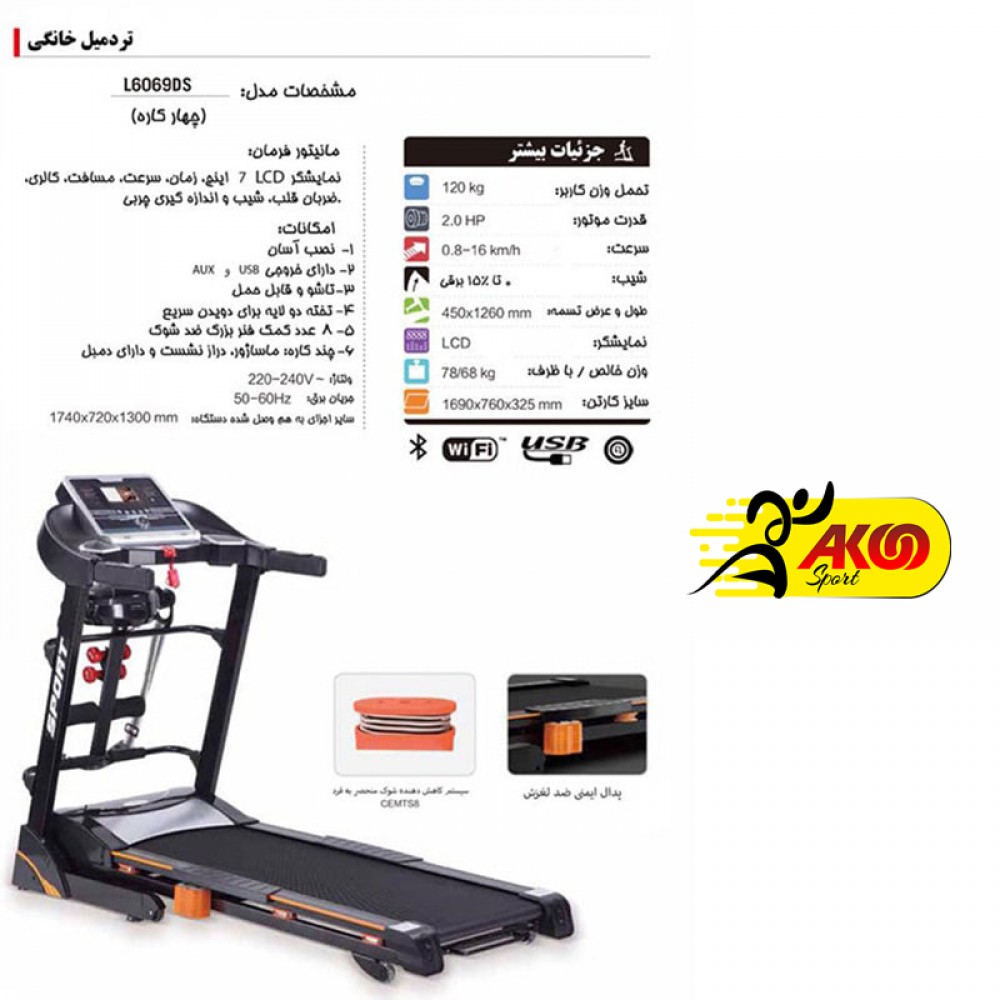 - دارای صفحه نمایش LCD با امکان نمایش شیب، سرعت، مسافت، کالری، زمان، تعداد تپش قلب، و چربی