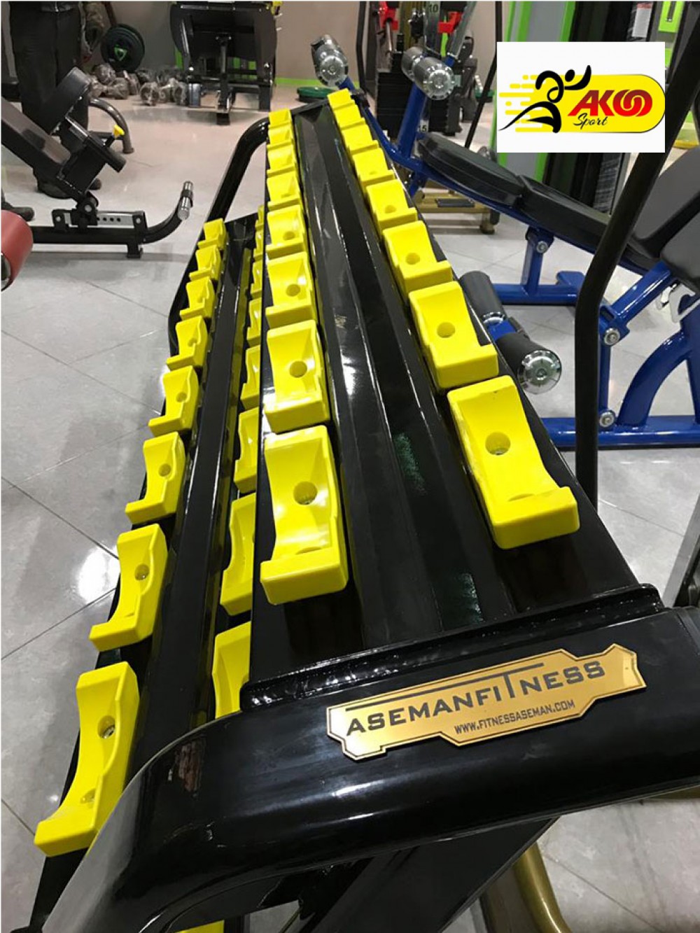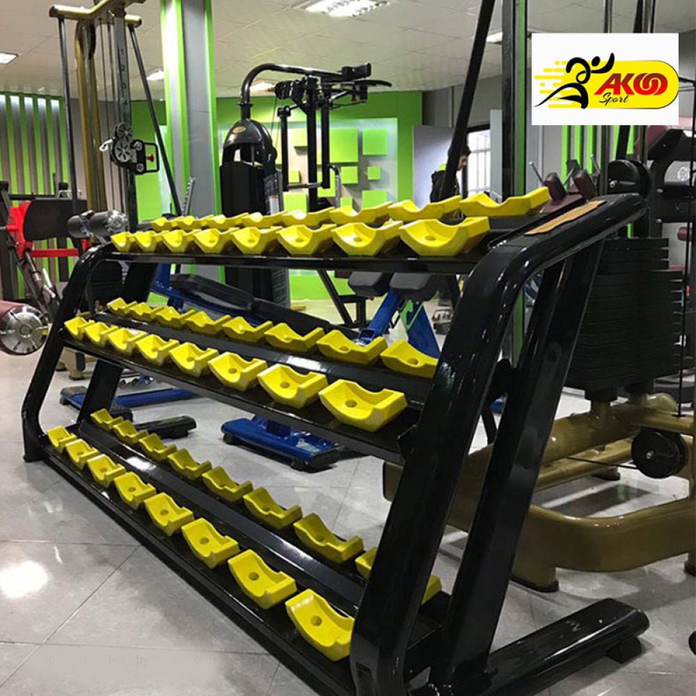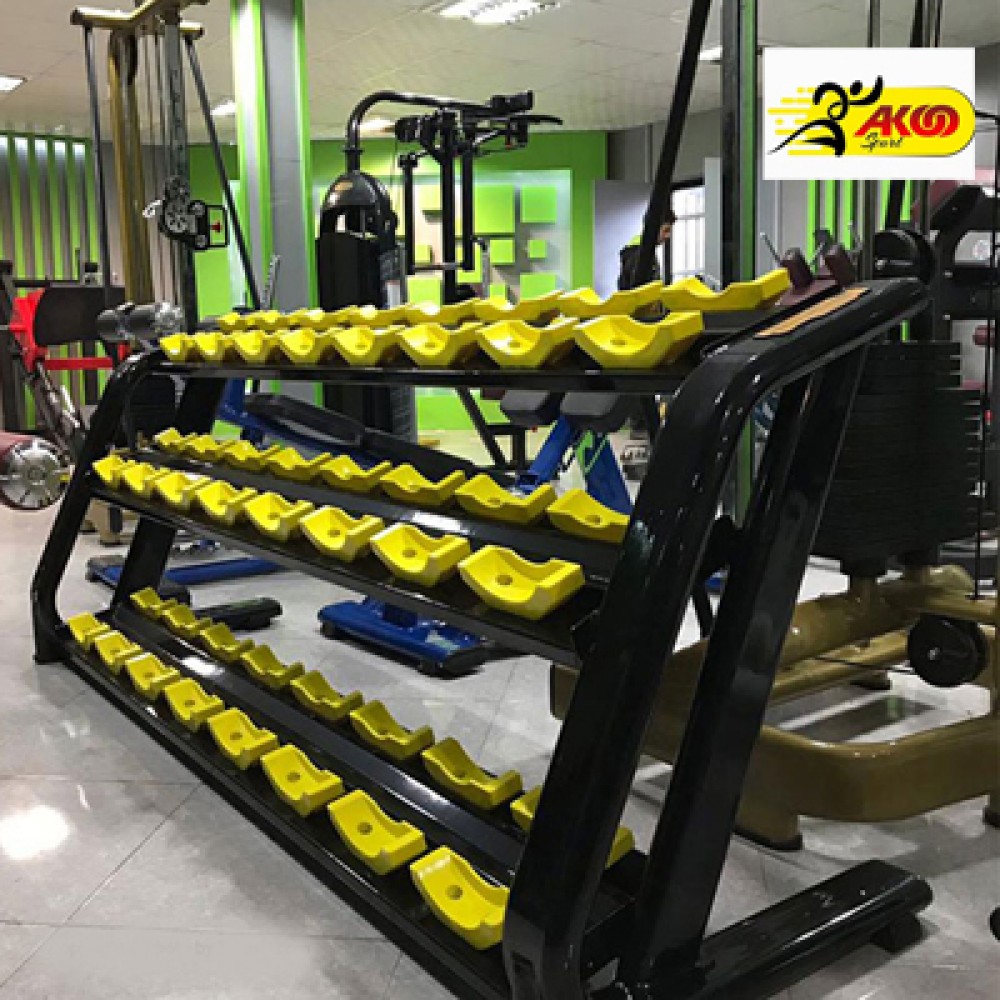 رک دمبل 3 طبقه : دارای 3 طبقه برای نگهداری دمبل ها ست که در هر طبقه 8 تعداد دمبل یعنی مجموعاٌ 24 دمبل را میتواند نگهداری کند .