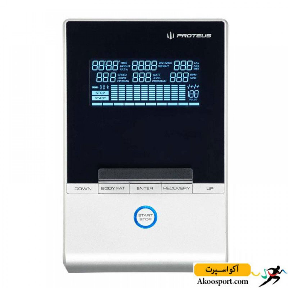 نمایشگر الپتیکال حرفه ای پروتئوس در هنگام تمرین با دستگاه، موارد مختلفی مانند زمان تمرین، کالری مصرف شده، مسافت پیموده شده،
