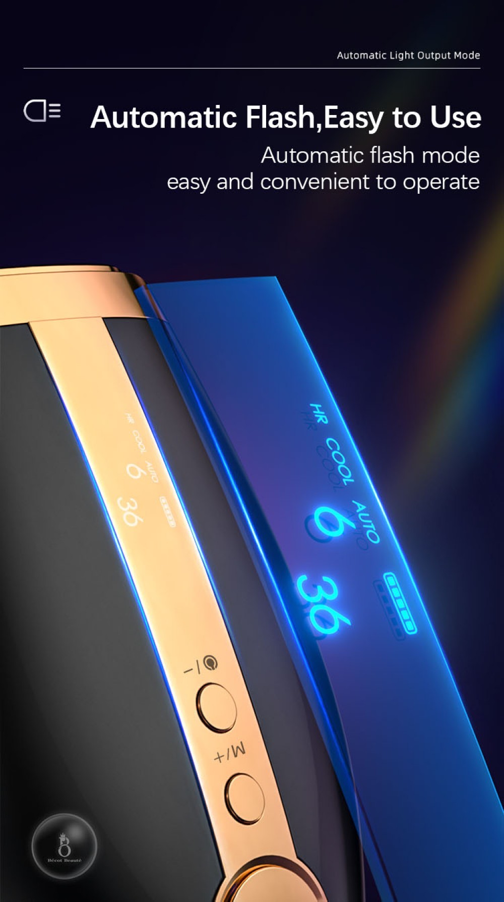 در صفحه نمایشگر LCD نشانگرهای مد دستگاه (جوانسازی، رفع موهای زائد) و سطح انرژی، تعداد شاتهای زده شده، شات اتوماتیک دستگاه، نشانگر کولینگ وجود دارد، .