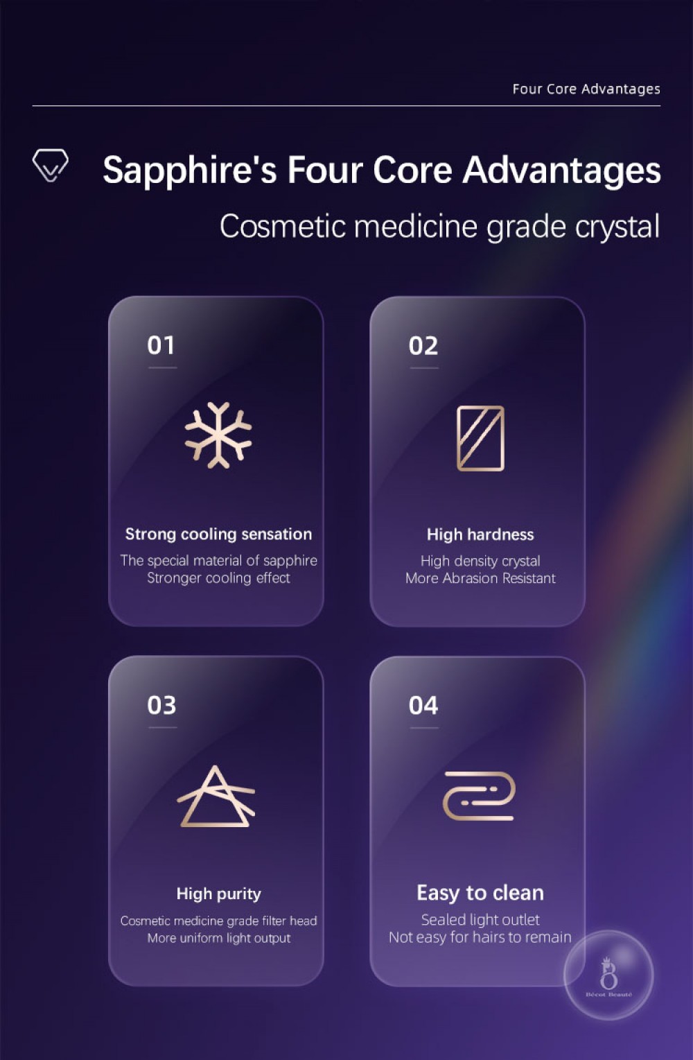 مدل b۰۰۱ مجهز است تکنولوژی کولینگ سافیر که برای راحتی بیشتر در استفاده از لیزر رفع موهای زائدو جوانسازی دما بین ۳ الی ۱۰ درجه تنظیم می کند. بدون نیاز به ژل.